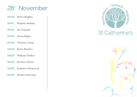 28 November th 2020 Sylvia Hughes 2021 Stephen Bedson 2021 Ian Graham 2022 Sylvia Rigby 2022 Thomas Cowan 2023 Kevin Bamber 2023 William Fielden 2023 Barbara Hatton 2023 Kathleen Wickstead 2023 Barbara Harrison