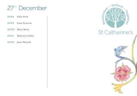 27 December th 2018 Sally Peck 2019 Irina Pearson 2020 Mary Batty 2021 Malcolm Fisher 2022 Janet Russell